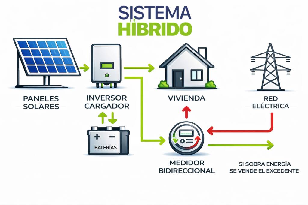 La fusion de los dos sistemas, la seguridad del back up de baterías con la eficiencia de la conexión a red. Ahorro energético y autonomía ante cortes de suministro.